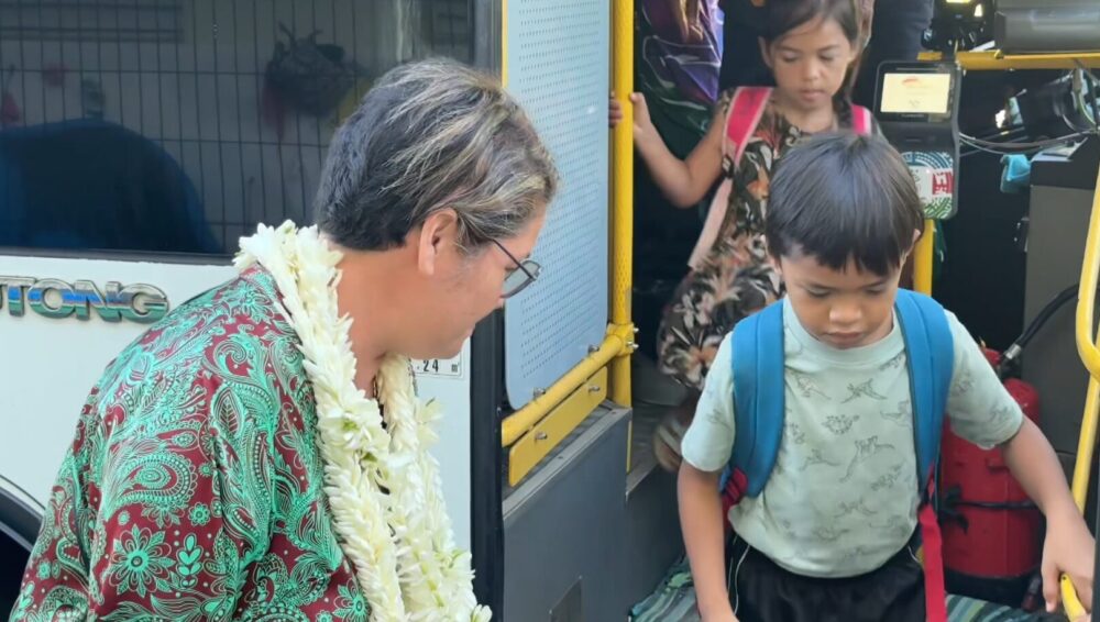 Après une semaine de vacances, c’est avec le sourire et dans des transports aux normes que les enfants de Moorea ont repris le chemin de l’école. Désormais c’est Juliana Ruta Transport qui assure le transfert des scolaires à la place de la société Warren Transport. Une décision prise en urgence et annoncée la semaine dernière par la ministre de l’Éducation Samantha Bonet Tirao. De quoi répondre à une urgence : ramener les élèves sur les bancs de l’école. « L’idée de cette première semaine, et c’est pour ça que je suis ici aujourd’hui avec mes techniciens, c’est d’améliorer, parce que là c’est un essai. On sait combien on a d’élèves à tel ou tel point de ramassage et l’idée, c’est de réajuster les passages pour qu’on puisse dire aux familles : « On va venir entre 6 h 50 et 7h et pas à 6 h 30 ou 7h ». Nous devons réguler les parcours en fonction des points qu’on a relevés. »