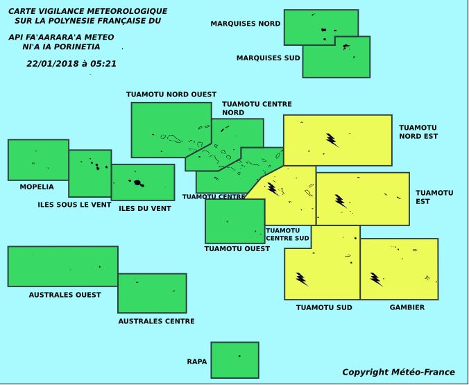 C’est un temps perturbé qu’annonce Météo France pour les îles Tuamotu et Gambier en ce lundi. Des averses orageuses sont prévues. Les prévisionnistes ont placé l’archipel en vigilance jaune pour les orages.