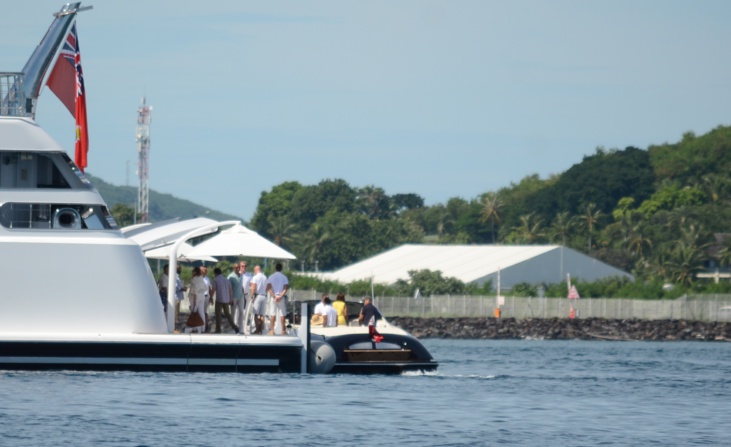 9h. Le Rising sun passe par le port de Papeete et longe la côte. Avec ses 138 mètres de longs, c’est l’un des plus grands yachts du monde. Il manoeuvre paisiblement dans le lagon jusqu’au nord de l’aéroport.