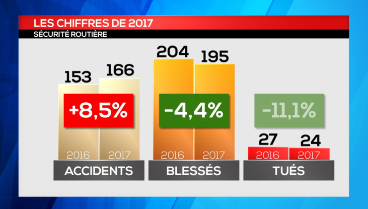 D’abord, le nombre d’accidents est en hausse de 8,5% par rapport à 2016. L’alcool, à l’origine de 67% des accidents mortels, reste un phénomène difficile à combattre malgré les contrôles.