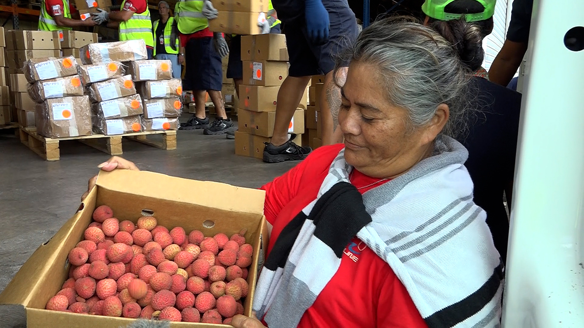 Devant les grilles du service fret, particuliers et grossistes attendent avec impatience leur commande. Yannes a par exemple demandé 50 kilos de cet « or rouge des Australes« , soit 10 cartons de 5 kilos.