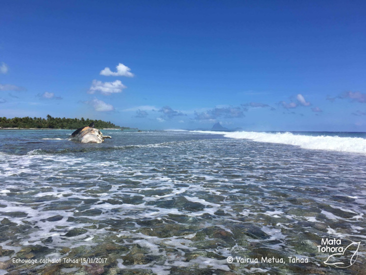 Le cachalot était coincé sur le récif entre deux motus près d’une pension de famille. Il était mort à l’arrivée de la gendarmerie de Tahaa. L’animal mesure 12.3 mètres et pèse pas moins de 20 tonnes. Selon l’association, il serait mort depuis plusieurs jours et victime d’attaques de requins.