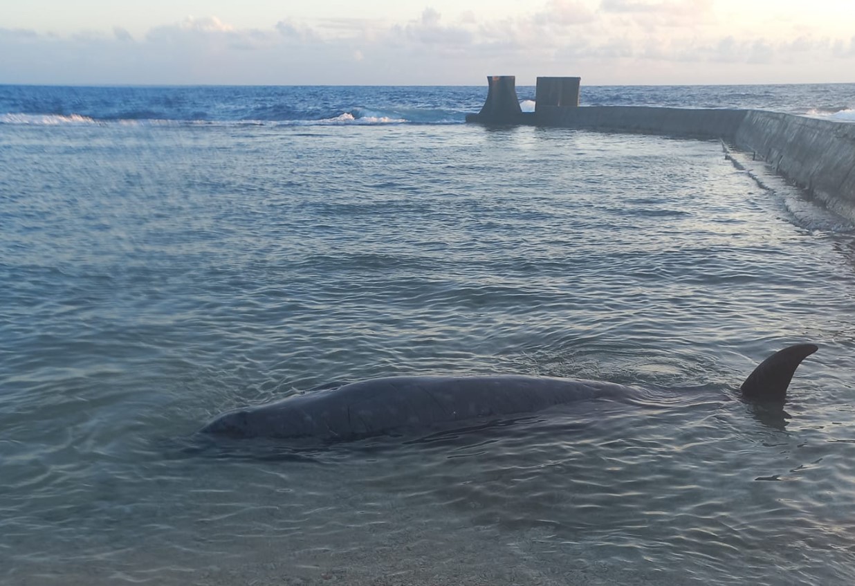 Le cétacé a été découvert gisant en bord de mer, non loin de la Fédération des Œuvres Laïcs. « Apparemment, il s’agit d’une baleine à bec de Cuvier de 4 mètres environ. À vue d’œil, c’est une mort naturelle. Il n’y a pas de traces d’attaque d’orques ou de requins », explique à TNTV Jean-Claude Teunu, le référent du réseau de protection des cétacés de la Diren à Hao.