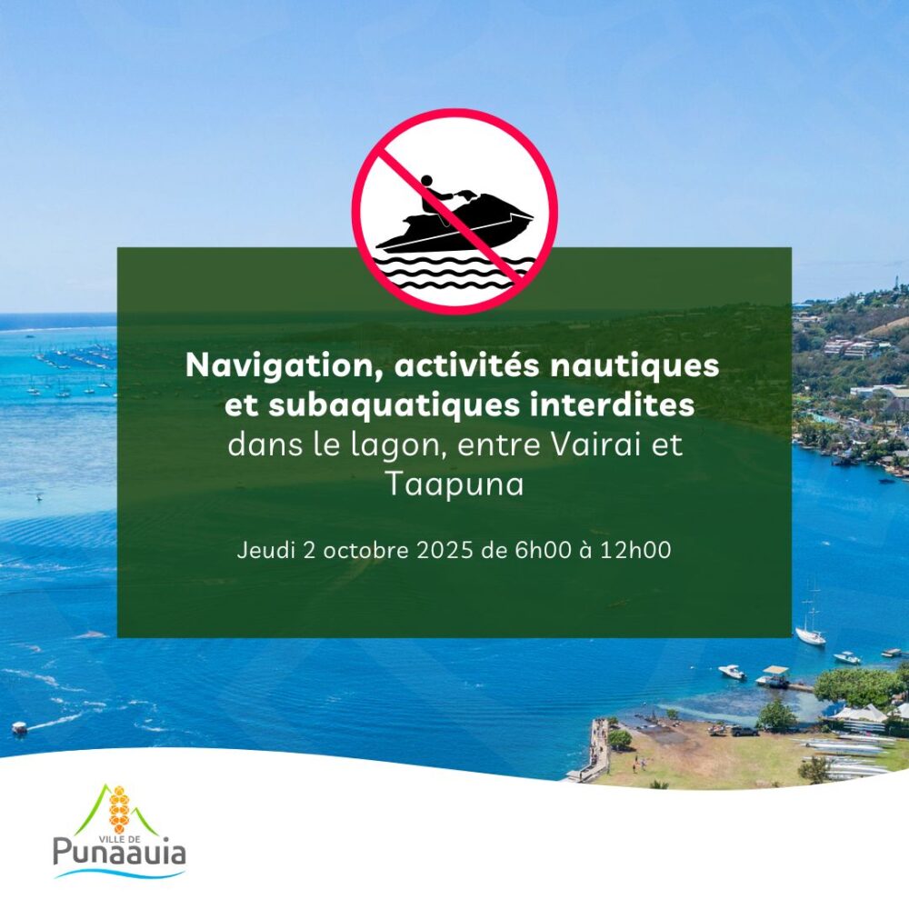 Pour garantir la sécurité de tous, la commune a pris un arrêté interdisant la baignade et toute activité nautique dans le secteur concerné ce jeudi de 6 heures à midi. Les accès mer de nos parcs communaux (Taapuna et Vaipoopoo) seront fermés aux mêmes heures.