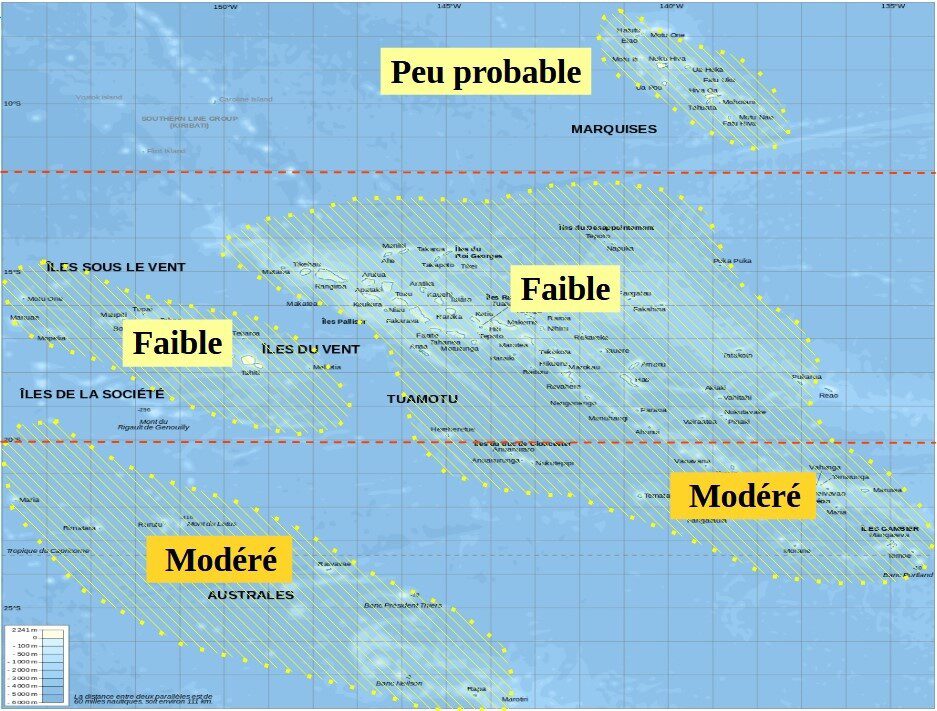 « Les perspectives de voir évoluer un phénomène nommé (dépression forte ou cyclone, NDLR) sont peu probables pour les îles Marquises, faibles pour les îles situées entre 12S et 20S de latitude et modérées pour les îles situées au sud du 20°S de latitude, surtout en deuxième partie de saison chaude », annonce Météo France Polynésie dans un communiqué.