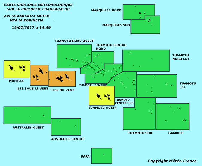 Des averses orageuses sont attendues dans la nuit de dimanche à lundi matin sur les Îles-Sous-le-Vent, elles peuvent encore occasionner de gros cumuls. Lundi, temps nuageux à très nuageux avec des averses isolées.