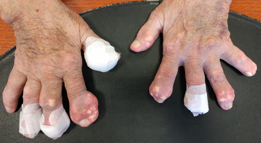 C’est le taux d'acide urique dans le sang. Lorsque ce taux s'élève, l'acide urique sous sa forme liquide atteint une concentration qui sature le sang. Et en se saturant, le sang se solidifie. En l'occurrence, il cristallise et se dépose partout, notamment dans les articulations, sous la forme de cristaux microscopiques, soit un centième de millimètre. De quoi déclencher une réaction de défense par le système immunitaire qui identifie les cristaux comme des agresseurs : c'est la crise de goutte. Non pris en charge, les crises se répètent, les articulations s’abîment, les cristaux s’accumulent et des tophus se développent.