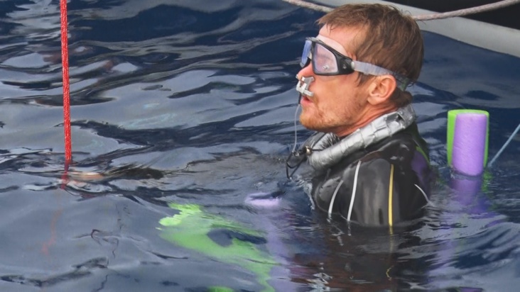 Après 20 minutes de relaxation et de préparation, il se lance pour une deuxième tentative. L’homme disparaît dans le bleu.