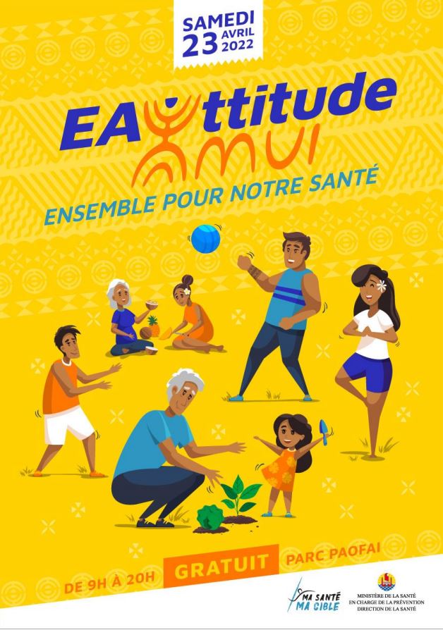 Mis en place par le ministère et la direction de la Santé depuis 2016, l’événement Ea’ttitude s’articule autour d’activités de prévention et de promotion de la santé dans toute la Polynésie. Pour l’édition 2022, la direction de la Santé entend valoriser le bien-être et la santé sous tous ses aspects et ainsi agir sur différents leviers tels que l’alimentation, l’activité physique mais aussi le rythme de vie et la cohésion familiale.