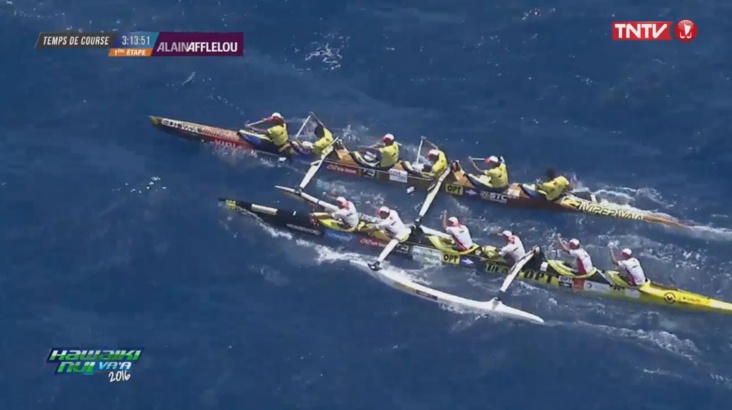 8h12: Un va’a s’est renversé à l’arrière de la course. Les pirogues de tête commencent à prendre des caps différents. Un vent arrière se forme.