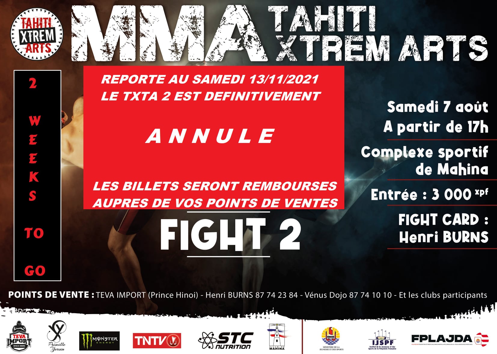 Ce mercredi les organisateurs annoncent finalement qu' »après avoir attendu au maximum et en accord avec la matchmaker Henri Burns , l’événement MMA TXTA 2 est définitivement annulé. »