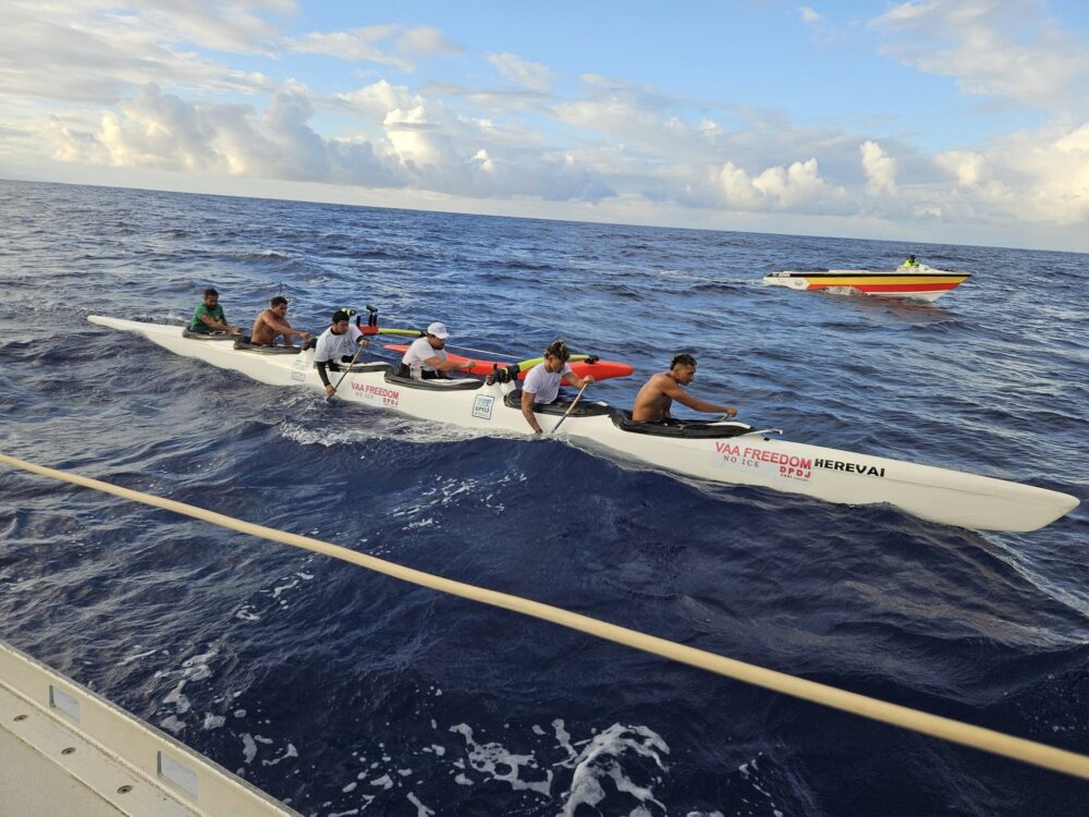 Ce mardi sur le coup de midi, l’équipage de Vaa Freedom a touché terre à Bora Bora, après avoir quitté Tahiti très tôt, lundi matin. Si leur première tentative de traversée avait échoué à cause de conditions météorologiques exécrables et d’une houle monstrueuse, cette fois, les rameurs ont tenu bon.