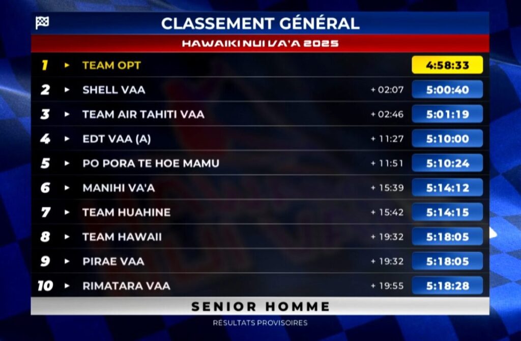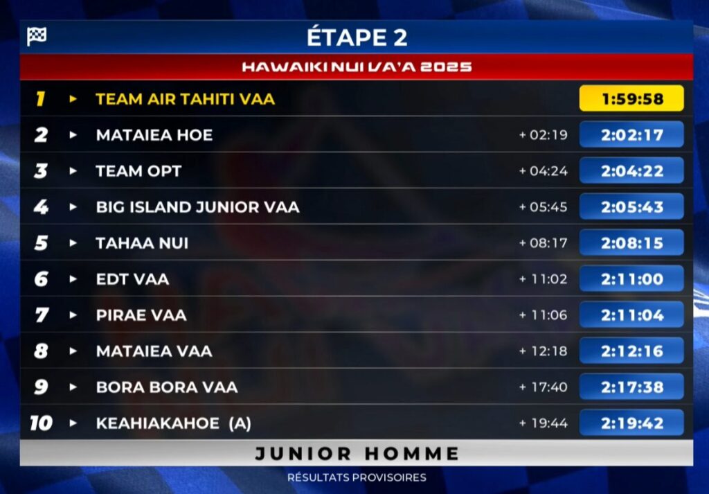 Chez les juniors, Air Tahiti s’impose en moins de 2 heures suivie de Mataiea Hoe et OPT. Les Hawaiiens arrivent 4e.