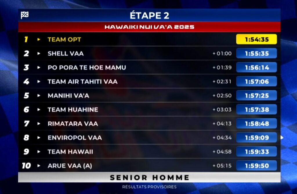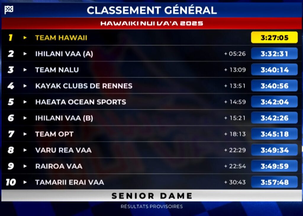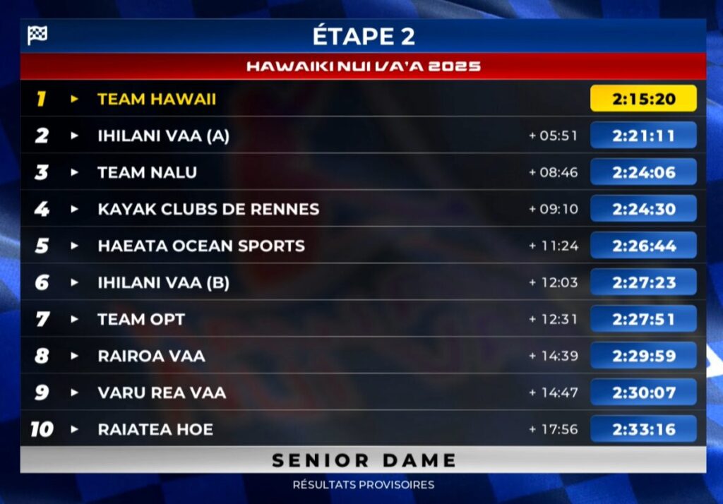 Chez les dames, les Hawaiiennes de Team Hawaii ont été plus fortes et remportent l’étape et la course au classement général. Ihilani Va’a, vainqueur de la première étape, arrive 2e. « Le départ, c’était un cafouillage, explique Vaimiti Maoni, capitaine de Ihilani va’a (…) On prend la deuxième place cette année, mais on est satisfaites quand même. Ce n’était pas facile ».